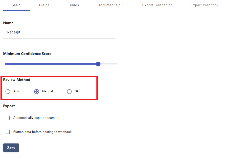 - Skip Review: If set to skip review, documents are automatically verified and moved to the Reviewed stage, enabling immediate data extraction via APIs.